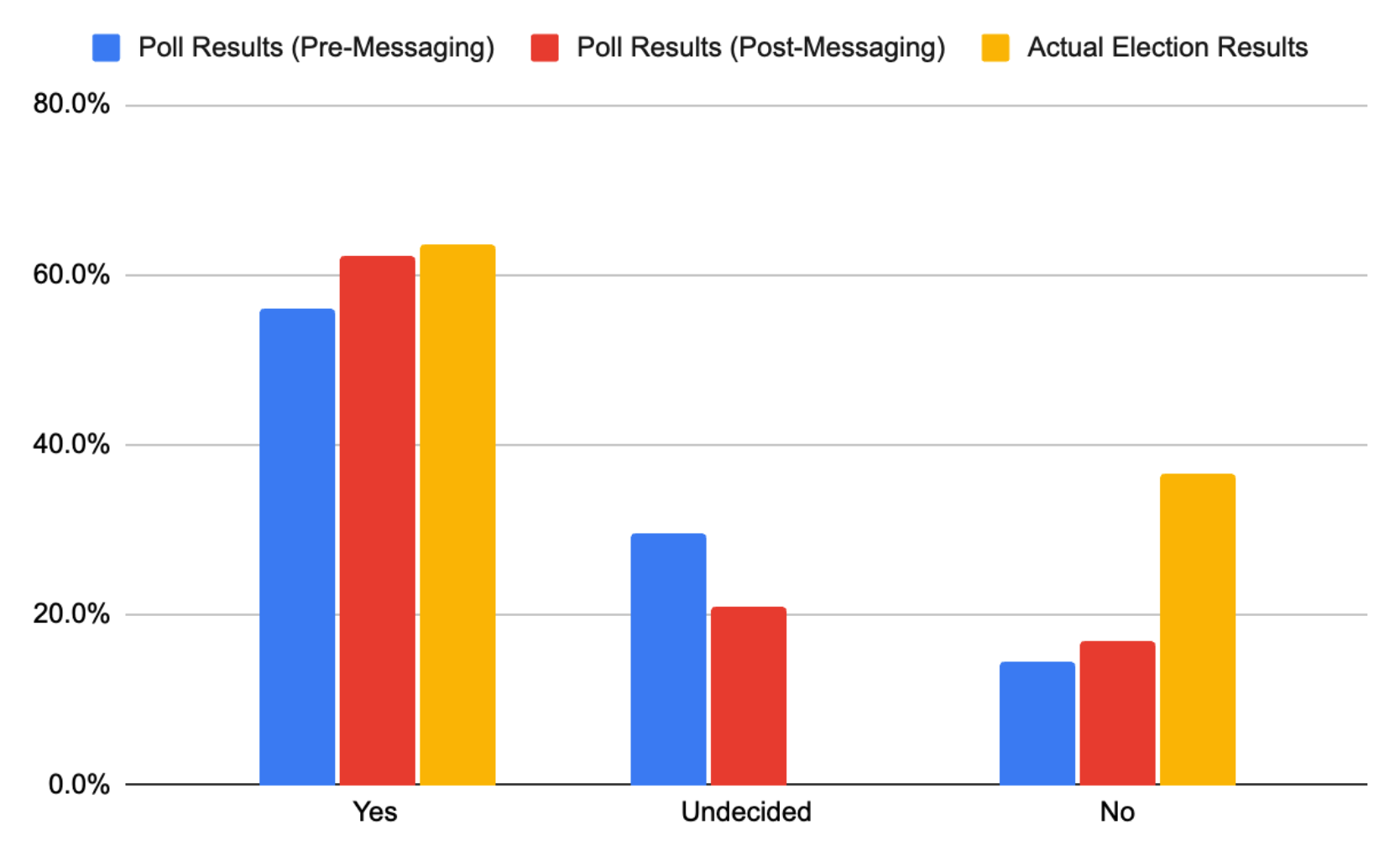 A sign of the positive nature of the ballot measure and our campaign messaging, as people learned more about the issue, they gravitated towards a YES vote. Final election results were only 1.4% off our findings.